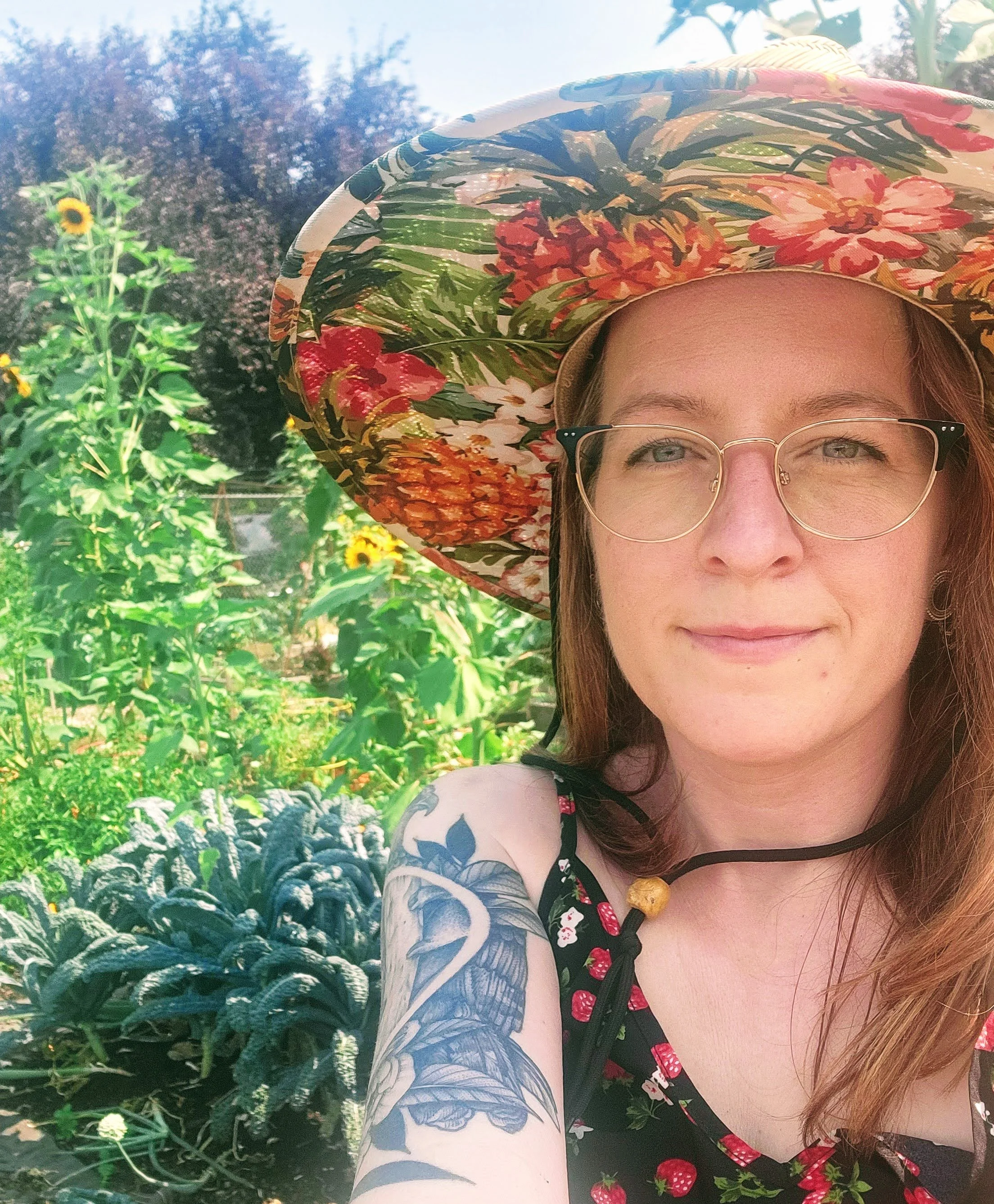 Description: Kay (Karin) Osterberg stands in a lush garden of sunflowers and kale. She is a white woman with blue eyes. She has long reddish blonde hair and is wearing wire rim cat eye glasses and a large colorful wide brimmed garden hat.